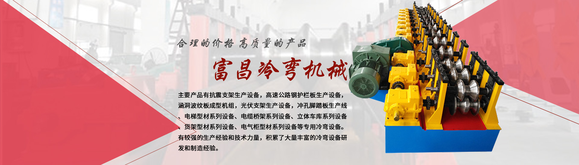 主要產(chǎn)品有抗震支架生產(chǎn)設(shè)備,高速公路鋼護(hù)欄板生產(chǎn)設(shè)備,涵洞波紋板成型機(jī)組,光伏支架生產(chǎn)設(shè)備,沖孔腳踏板生產(chǎn)線、電梯型材系列設(shè)備、電纜橋架系列設(shè)備、立體車庫系列設(shè)備、貨架型材系列設(shè)備、電氣柜型材系列設(shè)備等專用冷彎設(shè)備。